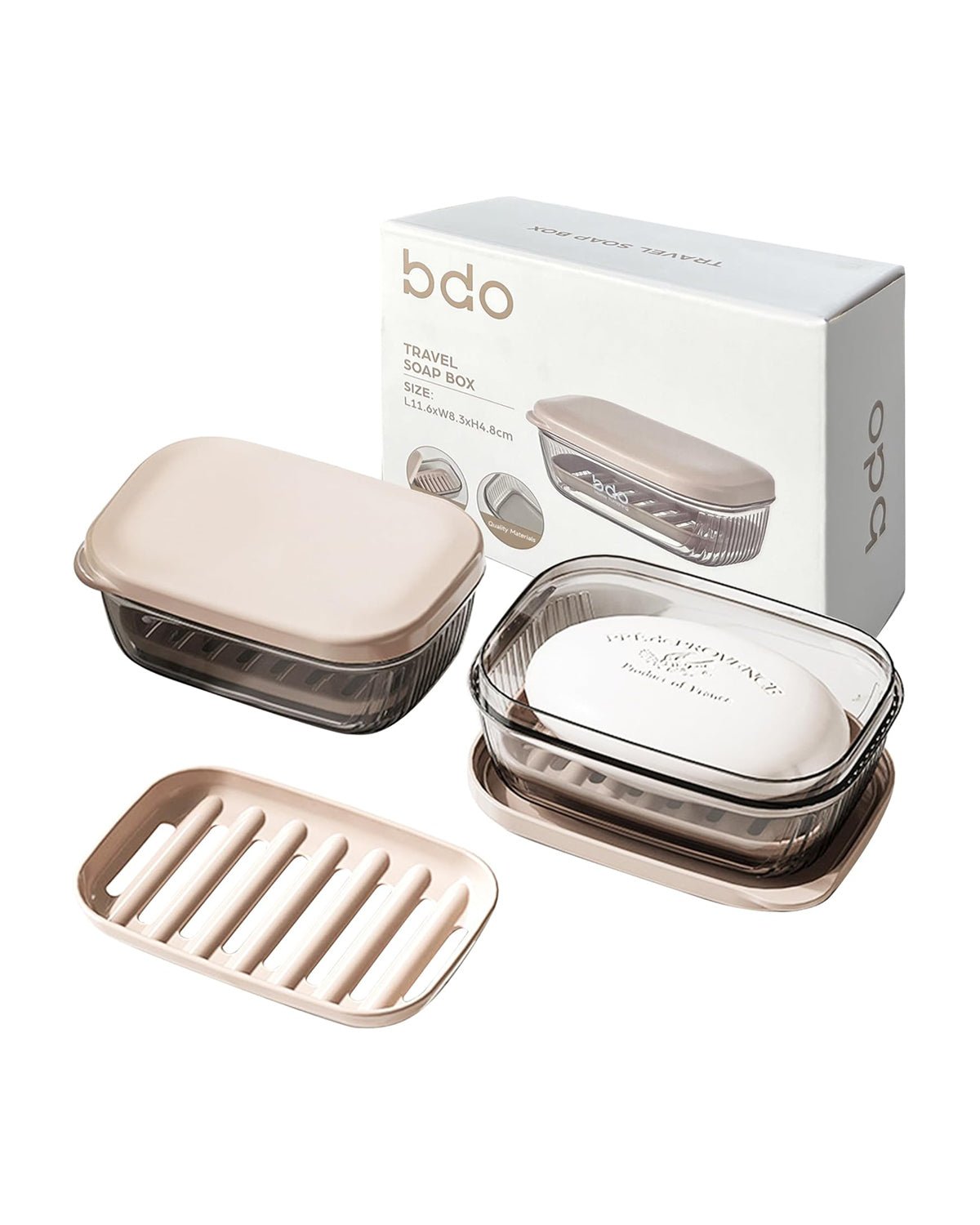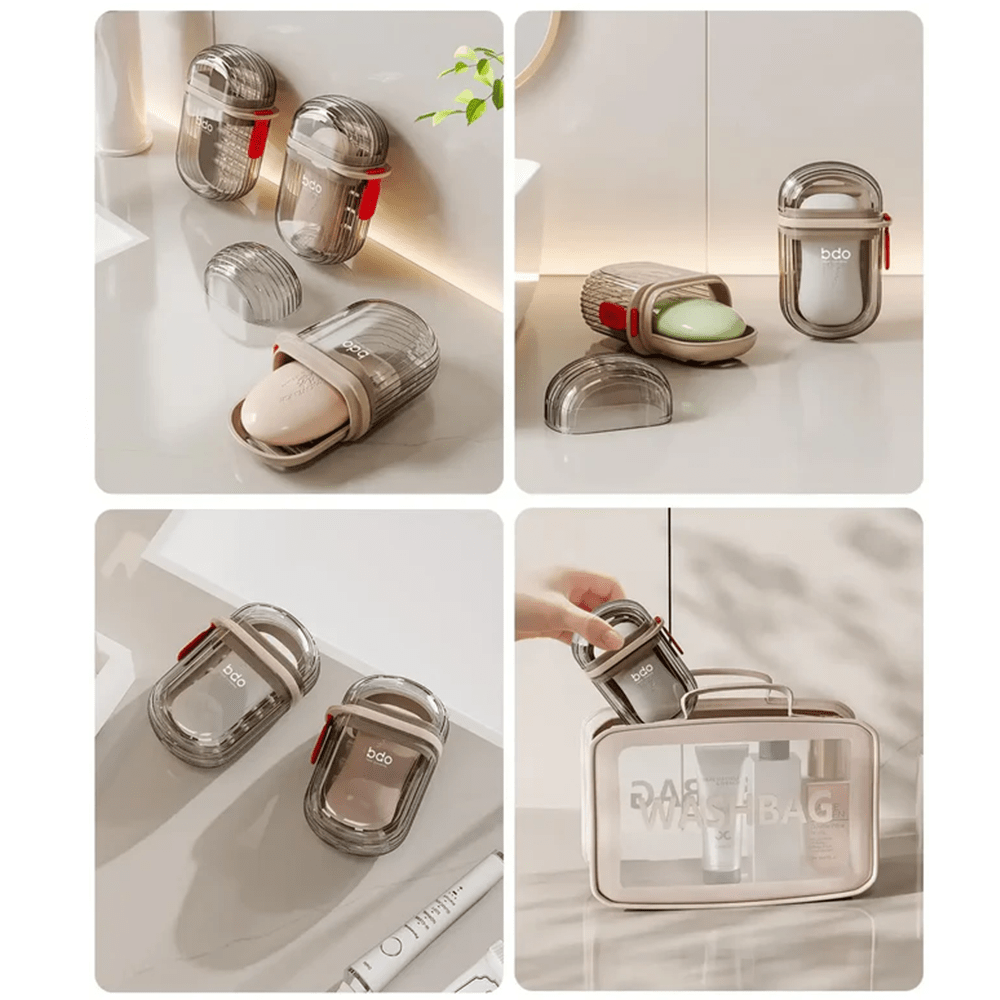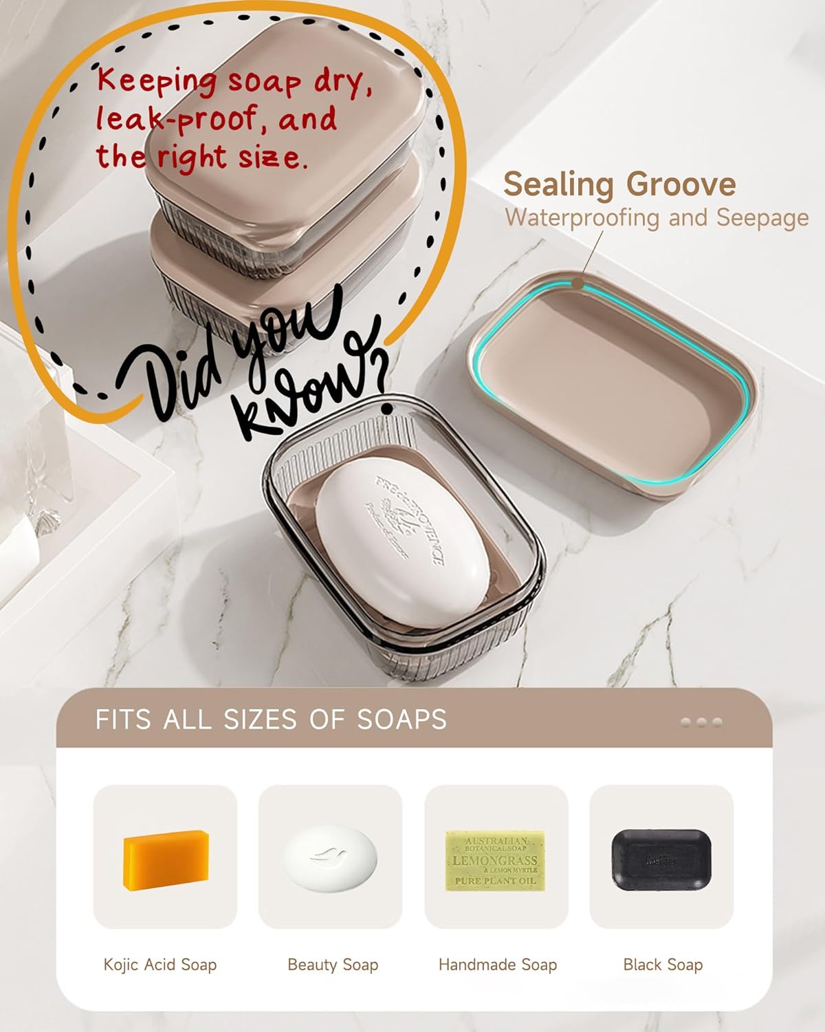 THREE-IN-ONE PORTABLE DESIGN: Ensure your soap stays dry and mess-free with our soap holder, featuring a premium drainage tray and a leak-proof lid. Perfect for on-the-go cleaning, whether you're at school or on a camping trip.